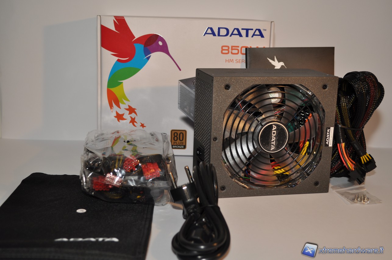 L’alimentatore HM-850 è contenuto in una scatola bianca dove sul fronte troviamo un’immagine del prodotto, le certificazioni 80 Plus Bronze e Nvidia SLI Ready e un colibrì multicolore nella parte sinistra. Il colibrì è il nuovo logo che contraddistingue A-Data, esprime un design più moderno e la loro visione orientata verso il futuro, con l’impegno di diventare uno dei maggiori marchi globali.