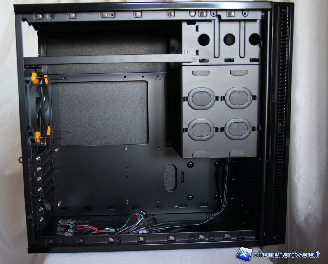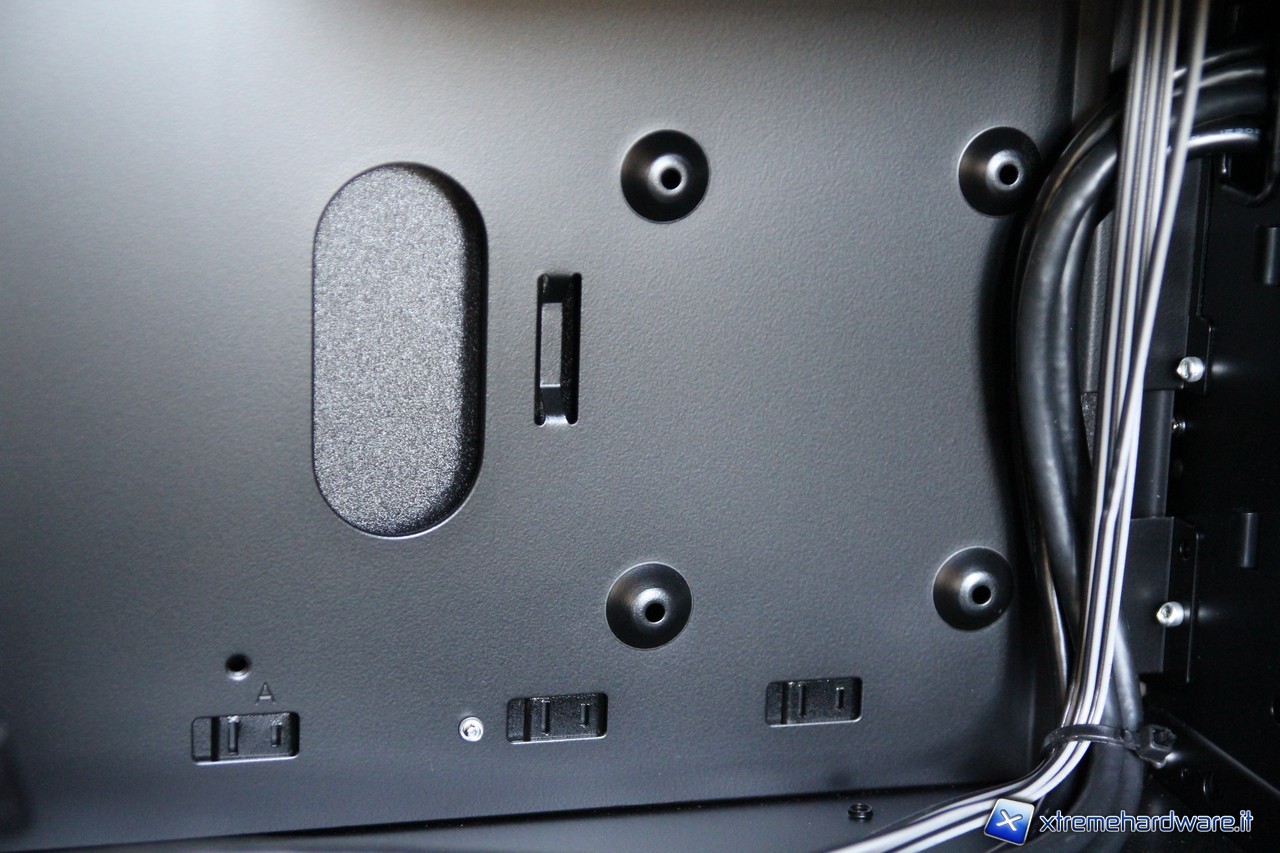 Una volta rimosso il pannello laterale destro, l'interno del cabinet risulta accuratamente verniciato di colore nero come per la sua parte esterna Risalta subito all'occhio l’ampio foro posto sul piatto della scheda madre, in corrispondenza del backplate del dissipatore per la cpu. Le operazioni di smontaggio e cambio del cooler risulteranno pratiche e veloci.