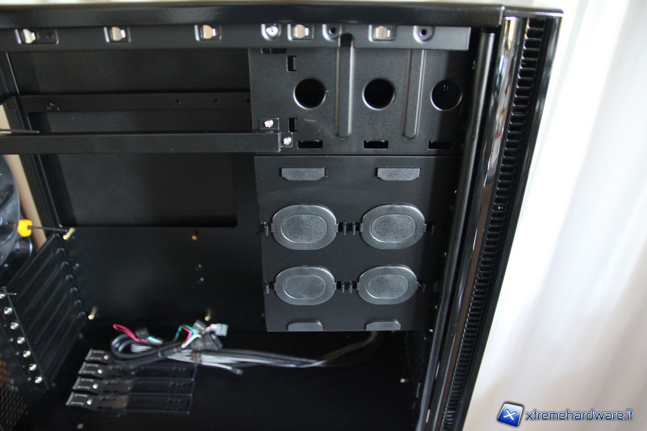 Si notano anche i due vani per il fissaggio di due periferiche da 5.25 pollici mediante le slitte forniteci nel bundle ed il cestello per gli hard disk, dove ricordiamo di poter istallare le periferiche con il classico sistema a "bracket" oppure in sospensione tramite il sistema proprietario Antec.