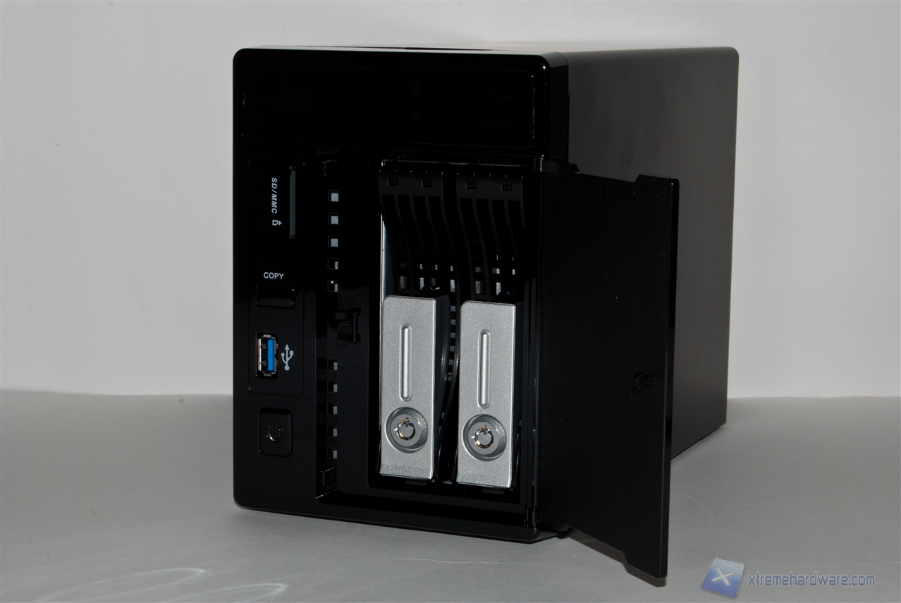 Il frontale, pulito ed elegante, presenta il tasto di accensione, un ingresso USB 3.0, il tasto di copia veloce del contenuto USB/memorie, il lettore di schede SD/SDHC/MMC ed uno schermo che si illumina in fase di utilizzo, indicando, oltre al marchio Thecus, l’attività dell’Hard Disk n#1, del secondo disco, l’attivita della rete LAN, della rete WAN e l’utilizzo del card reader o dell’ingresso USB.